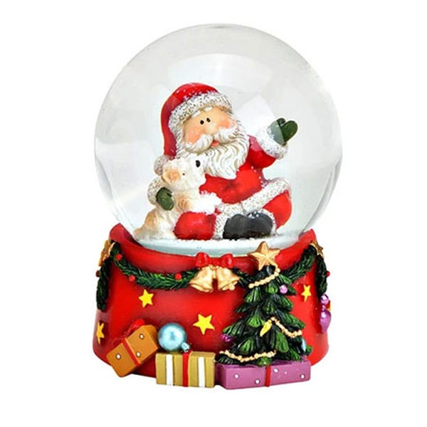 Dodatni opis: Novogodišnja snežna vodena kugla Deda Mraz koji se igra sa kučetom. Postolje je ukrašeno jelkom poklončićima jelovom girlandom i zvezdicama. Materijal postolja i figure u kugli polirezin. Deda Mraz i kuca sreća pod pahuljama u vašoj kugli.