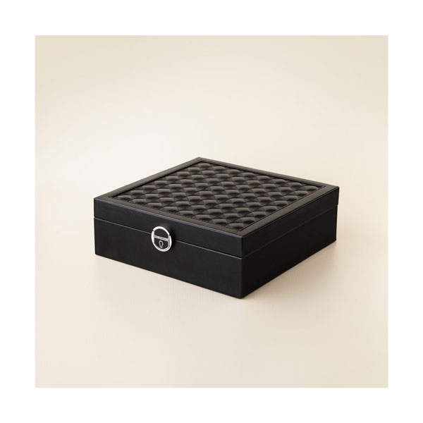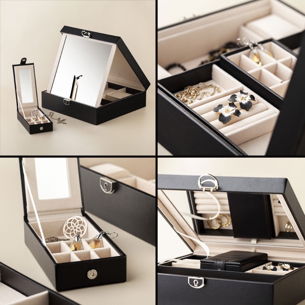 Kutija za nakit sa prenosnim delom odnosno manjom kutijom u sebi koja se može izvaditi i koristiti kao zasebna kutija. Posebno je praktična za putovanja. Velika kutija se zatvara tj. otvara uz pomoć kopče u srebrnoj boji a manja uz pomoć drikera srebrne boje koji je na kratkom kaišiću. Sa donje strane poklopca velike kutije celom površinom se prostire ogledalo. Dno kutije je rezervisano za krupniji nakit i satove a poklapa ga okvir sa malom putnom kutijom i mnoštvom pregrada za sitan nakit. Putna kutija takođe ima malo ogledalo ispod poklopca. Unutrašnjost obeju kutija obložena je mekim materijalom svetle boje koji sprečava oštećenja nakita.