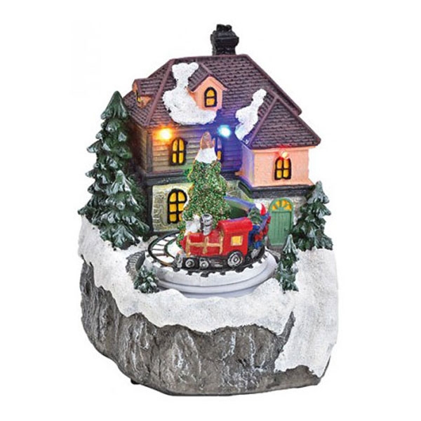 Dodatni opis: Novogodišnja dekoracija zimske kućice sa vozićem koji se vozi u krug oko jelke. Ima par led lampica koje svetle u različitim boj